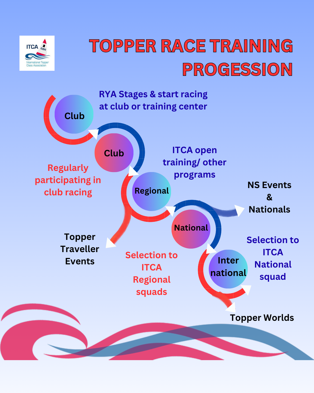 ITCA (GBR) members have access to a wide range of training and racing opportunities to help them enjoy their Topper sailing to the fullest. Most begin with Area Travellers and then progress to National Series events or the major annual national championships once they gain some racing experience.